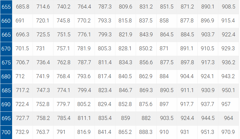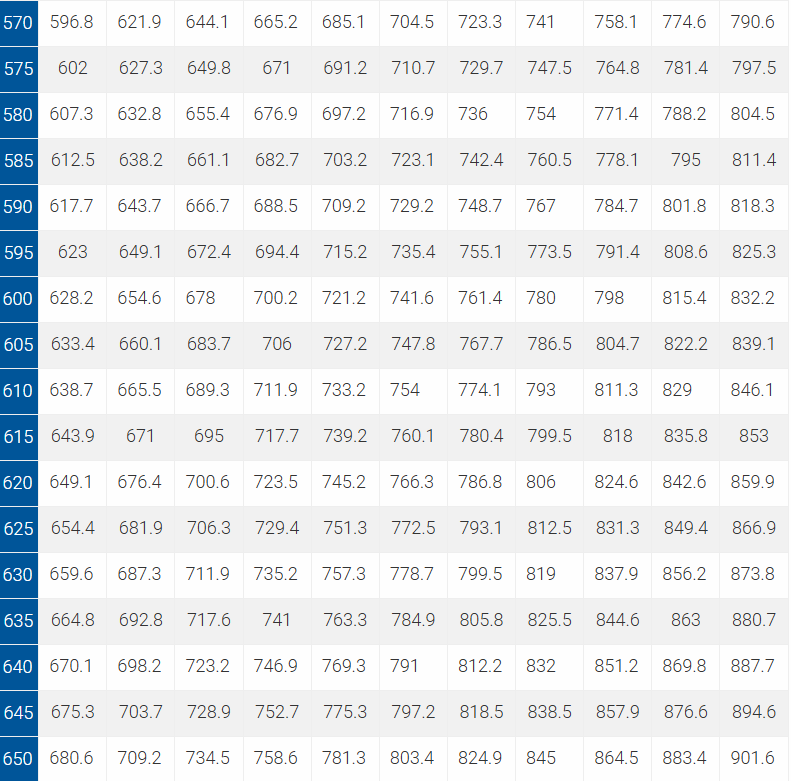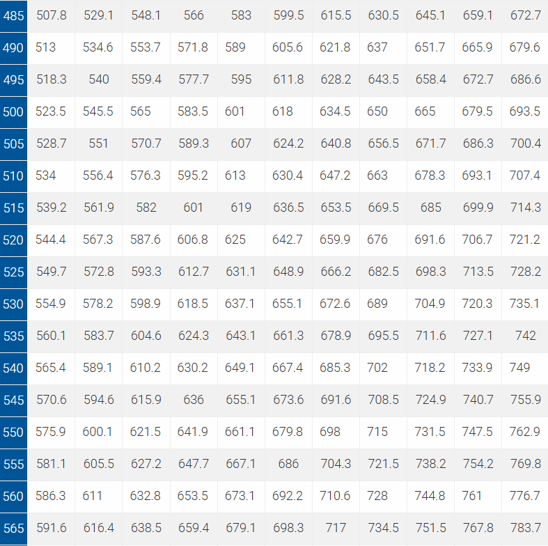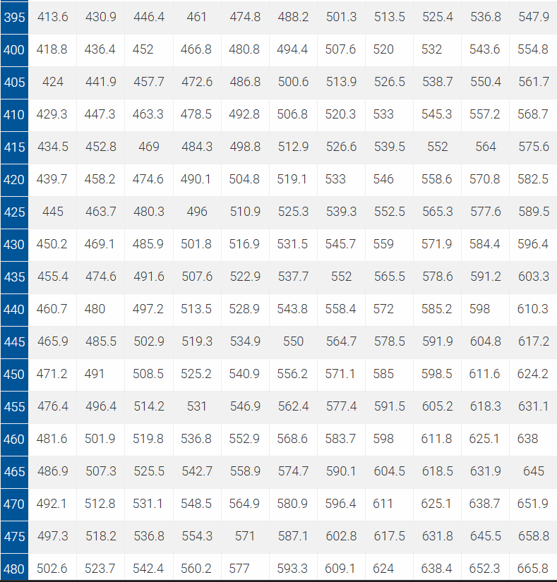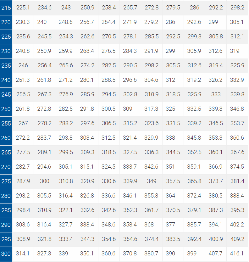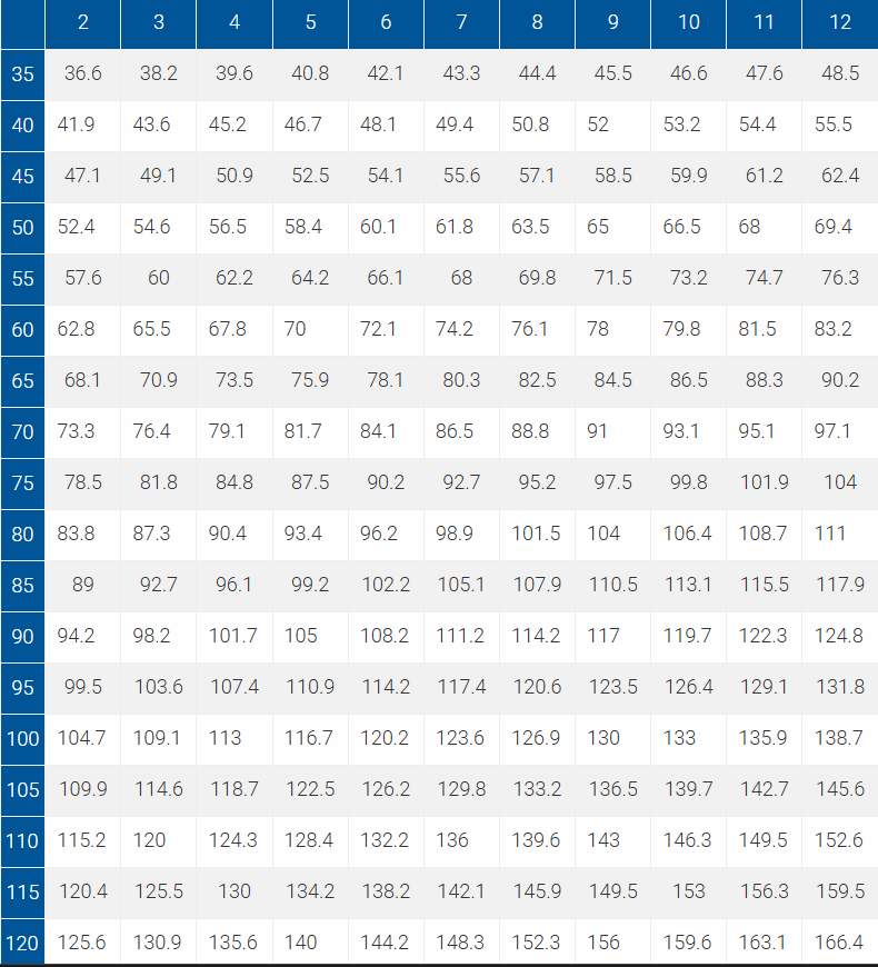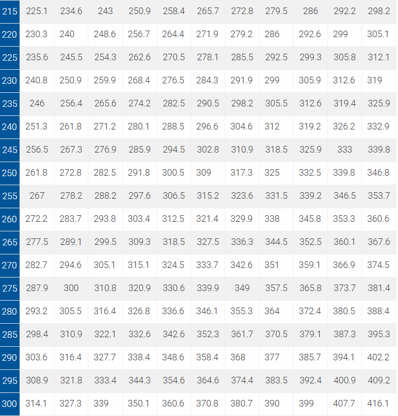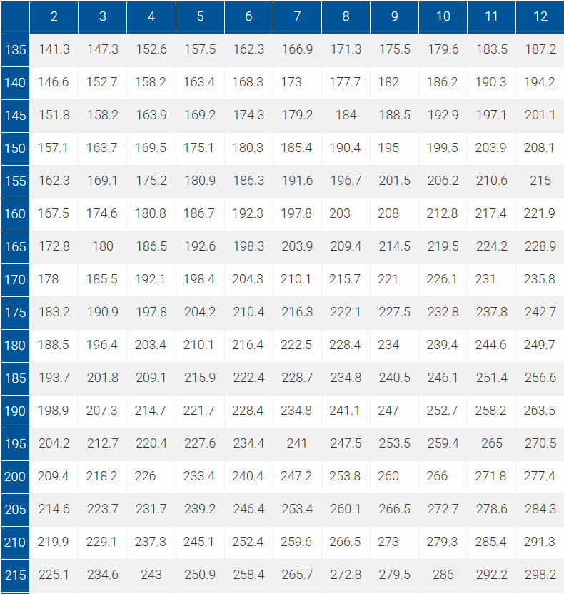 Bảng đầu tiên: sử dụng đơn vị pounds (lbs).