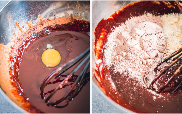 Đập từng quả trứng vào hỗn hợp, khuấy mạnh tay liên tục cho đến khi hỗn hợp mịn và hòa quyện đều.