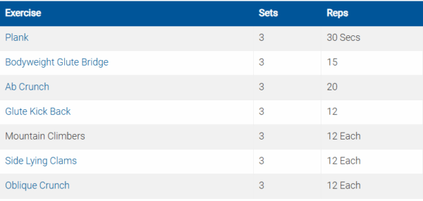 Sau đó tập Circuit bụng & mông: 3–4 vòng, nghỉ 45–60 giây giữa các vòng.
