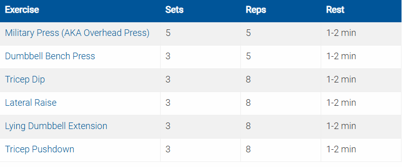 Ví dụ: nếu bạn có thể thực hiện Standing Barbell Press với 75 lbs cho 3 trong 5 hiệp (mỗi hiệp 5 reps), thì bạn có thể tăng lên 80 lbs.