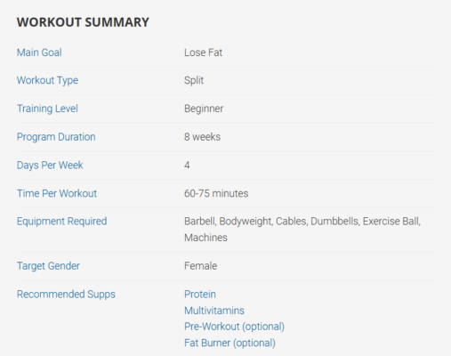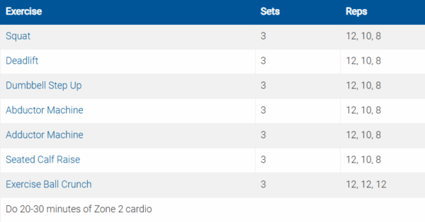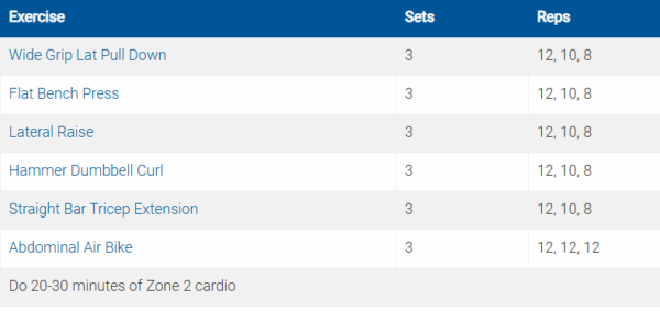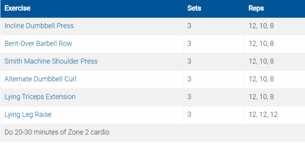 Chương trình này gồm 4 buổi tập mỗi tuần, kết hợp giữa tập thân trên (upper body) và thân dưới (lower body), trong đó có các bài tập cơ bụng (core) được xen kẽ vào cả hai nhóm.