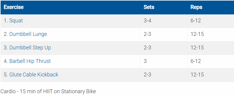 Phần thân dưới được tập 3 buổi/tuần, tập trung mạnh vào mông và chân.
