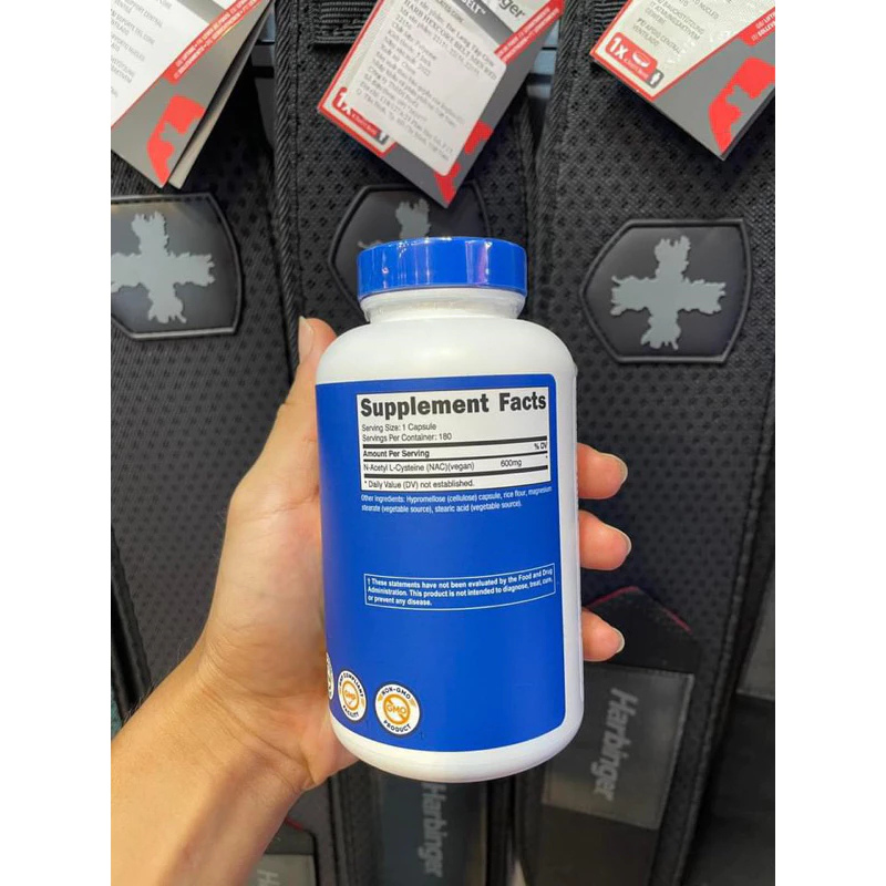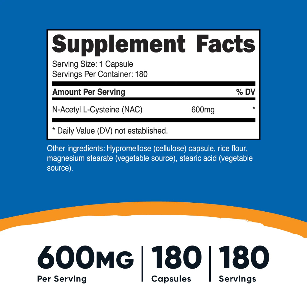 Mỗi khẩu phần Nutricost NAC 600mg (tương đương viên) chứa 600mg NAC (N-Acetyl-Cysteine).