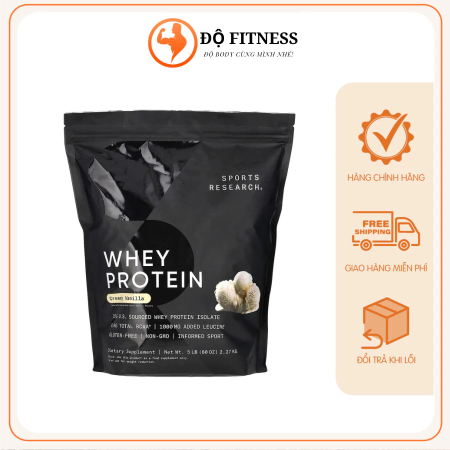 Thành phần chính 25g Protein, 6,9g BCAA, 1g Leucine (bổ sung), 3,5g fat, 2g carb, <1g đường Nguồn Protein 100% Whey Isolate Hương vị Creamy Vanilla Thương hiệu Sports Research – Mỹ ƯU ĐIỂM NỔI BẬT CỦA SPORTS RESEARCH WHEY PROTEIN