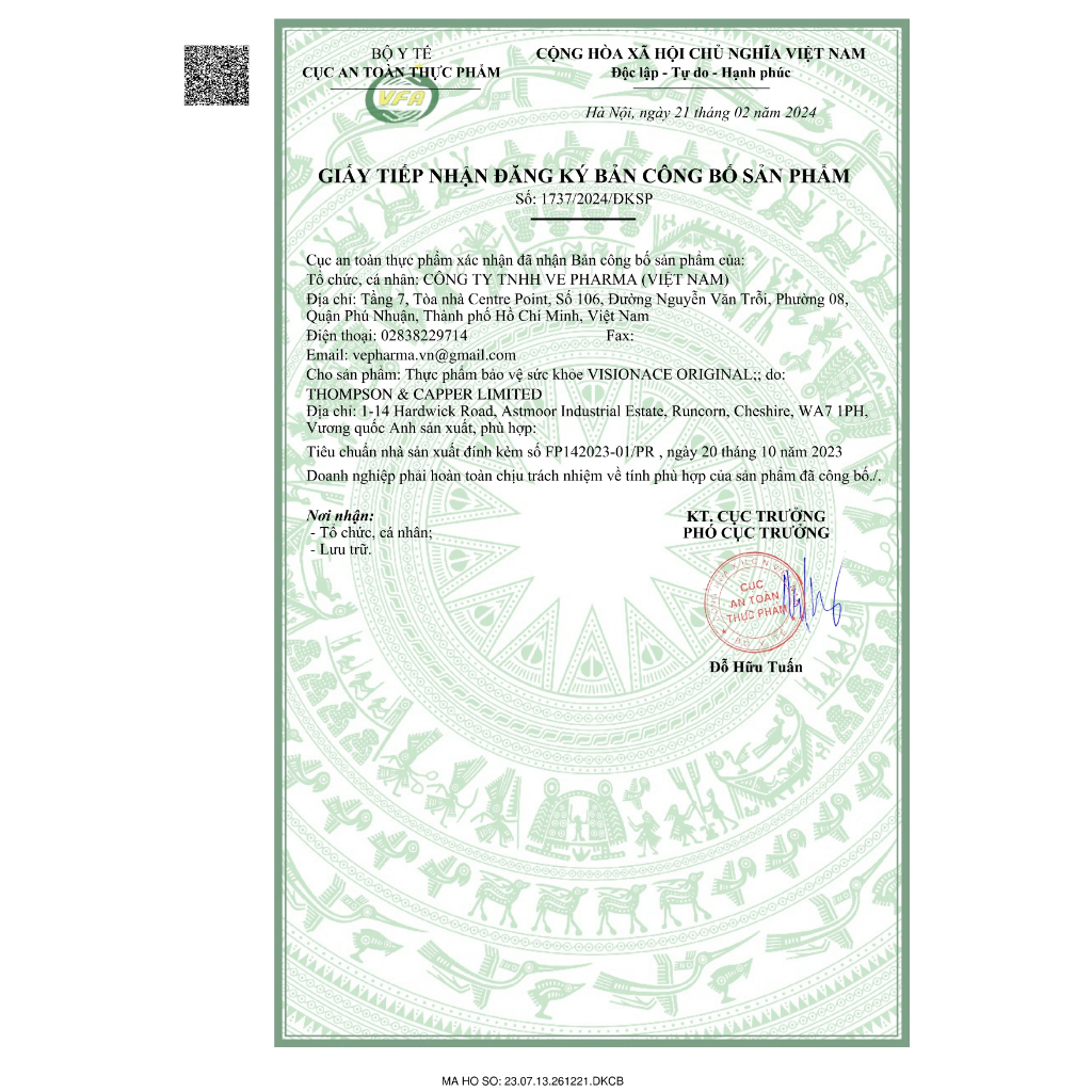 Thương nhân chịu trách nhiệm sản phẩm: Công ty TNHH VE Pharma (Việt Nam): Độc quyền nhập khẩu, phân phối và tiếp thị các sản phẩm Vitabiotics Anh Quốc tại Việt Nam