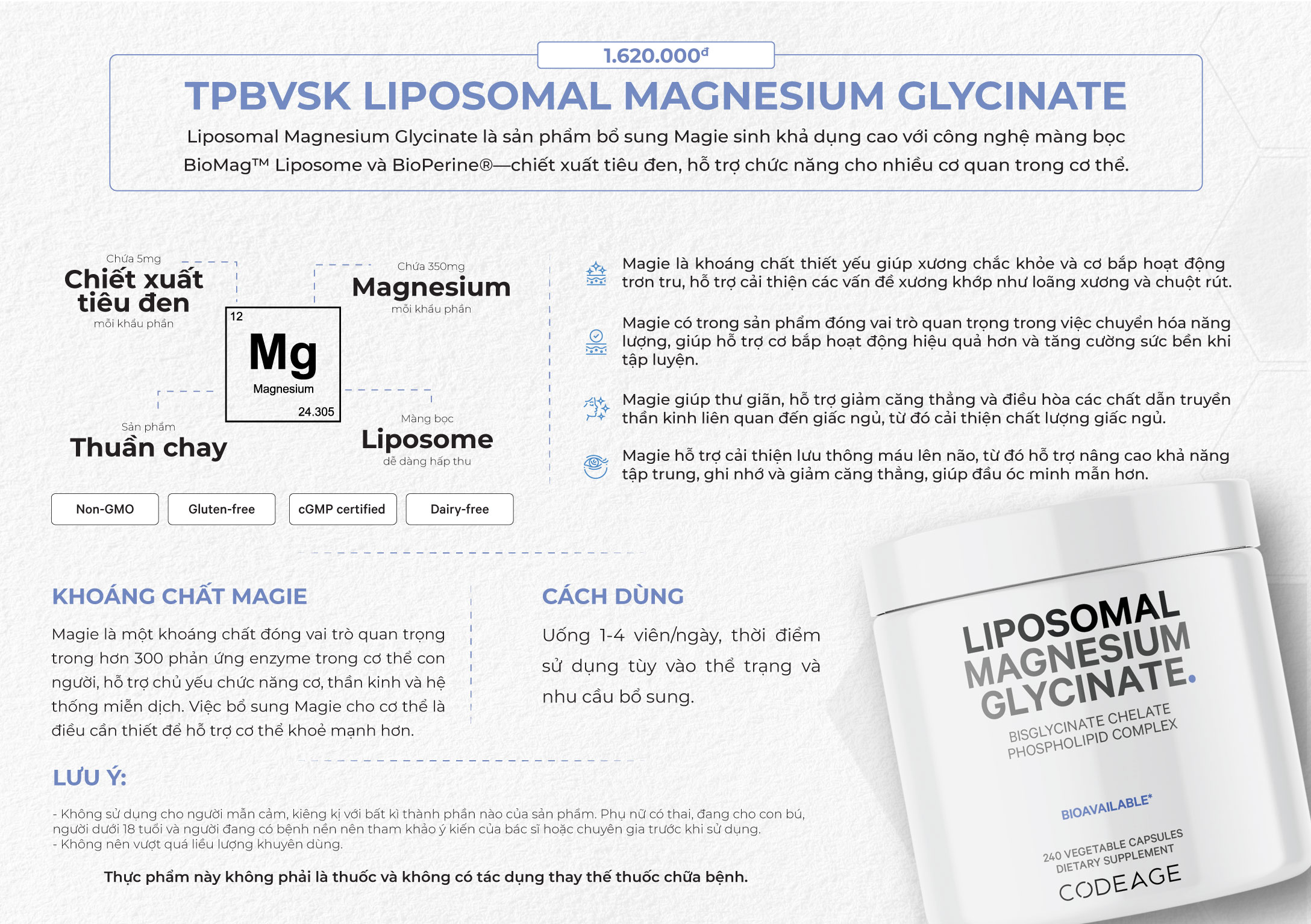 Magie dưới dạng Bisglycinate Chelate là loại có sinh khả dụng và khả năng hấp thụ cao nhất, an toàn và hạn chế tác dụng phụ nhất.