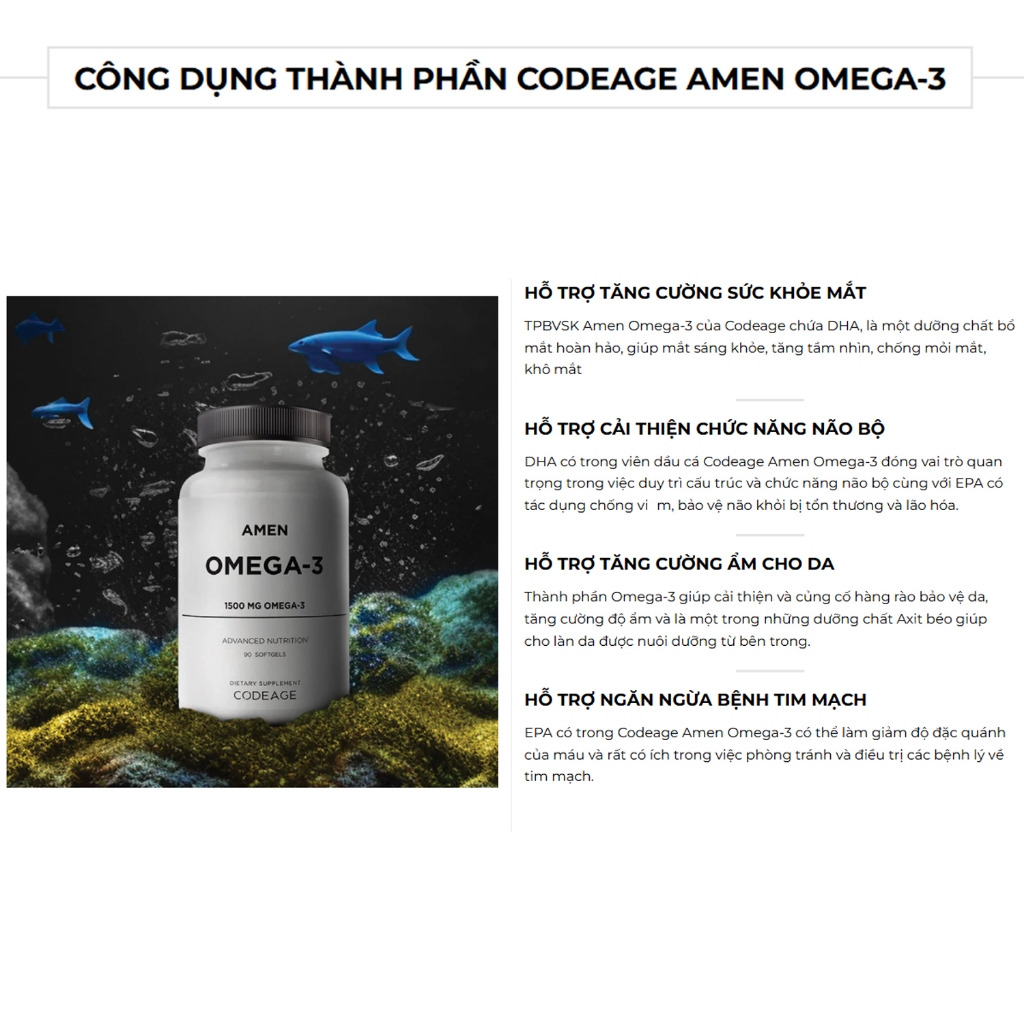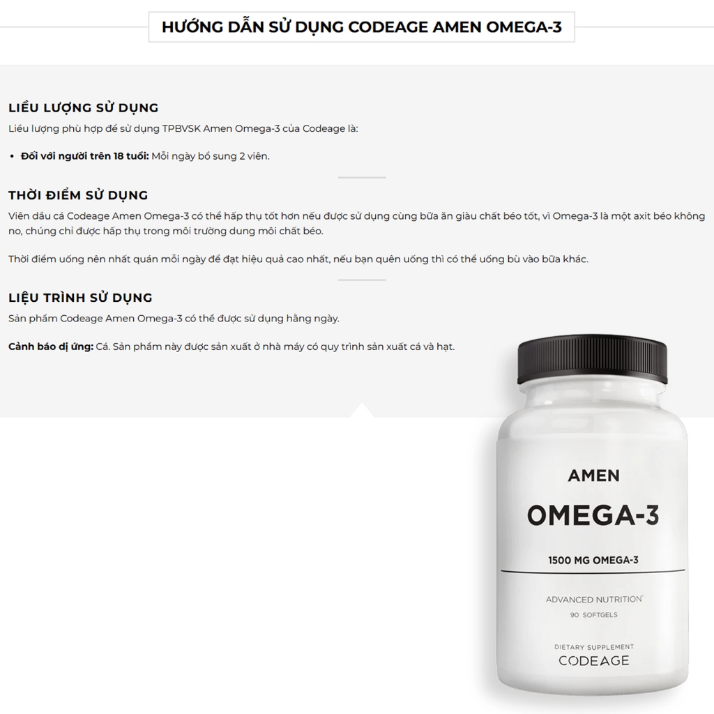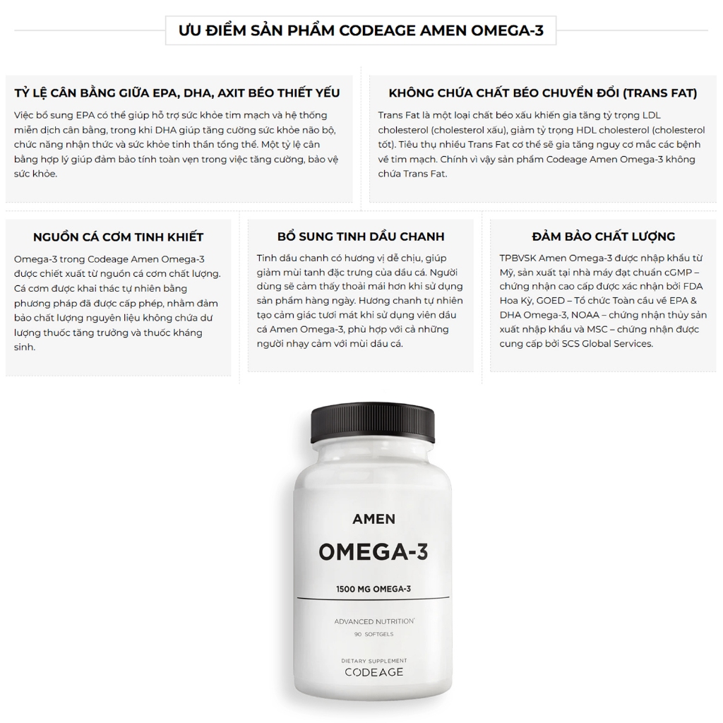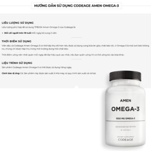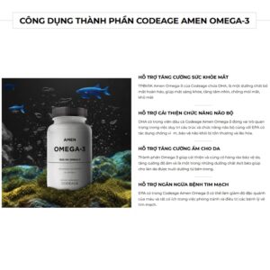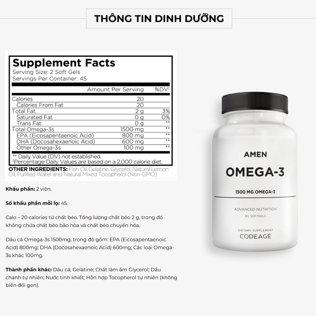 – Amen Omega-3 bổ sung hàm lượng 1500mg Omega-3 mỗi khẩu phần. Cung cấp axit béo EPA, DHA và các axit béo thiết yếu khác để giúp hỗ trợ sức khỏe tim mạch và chức năng não.