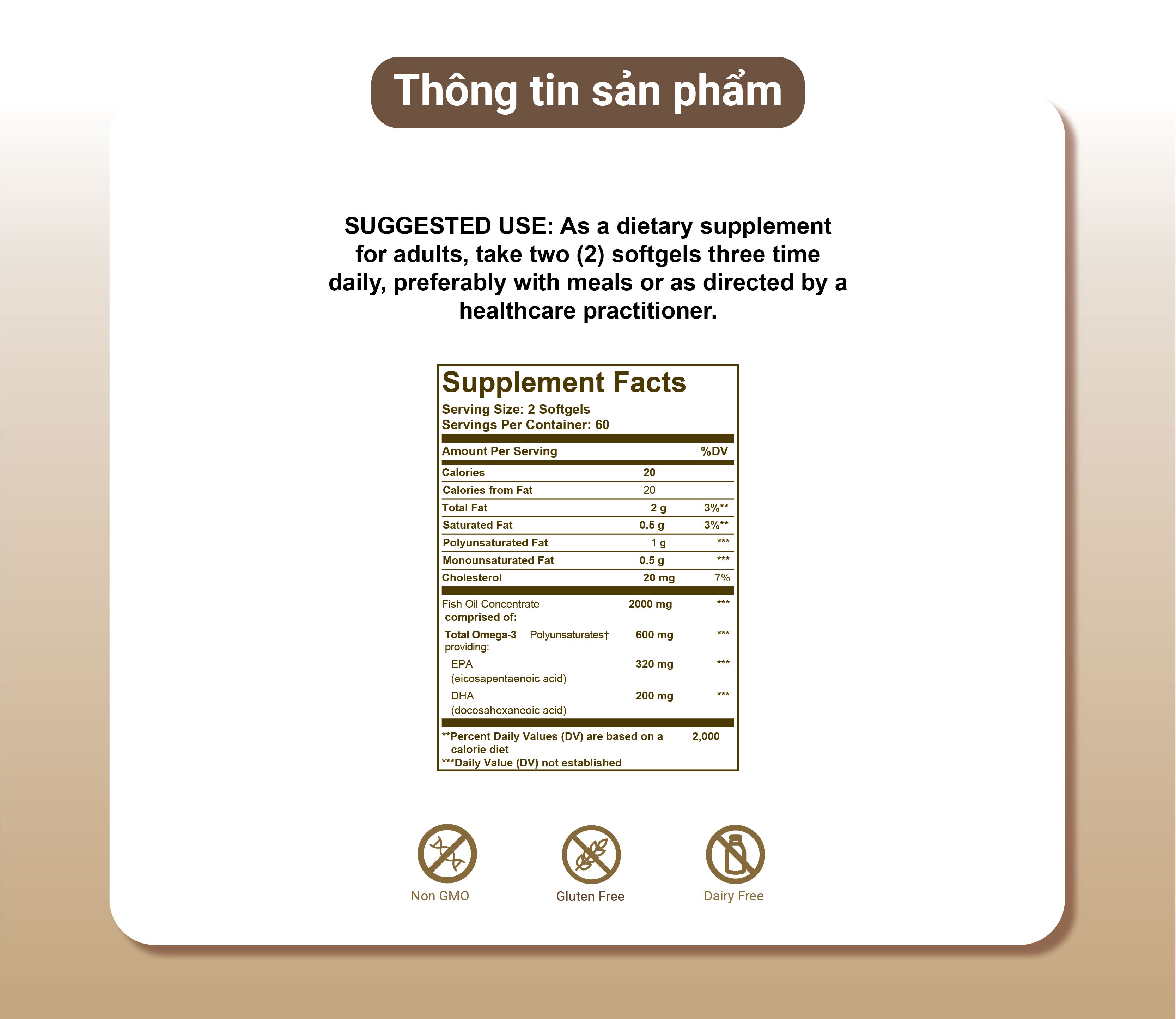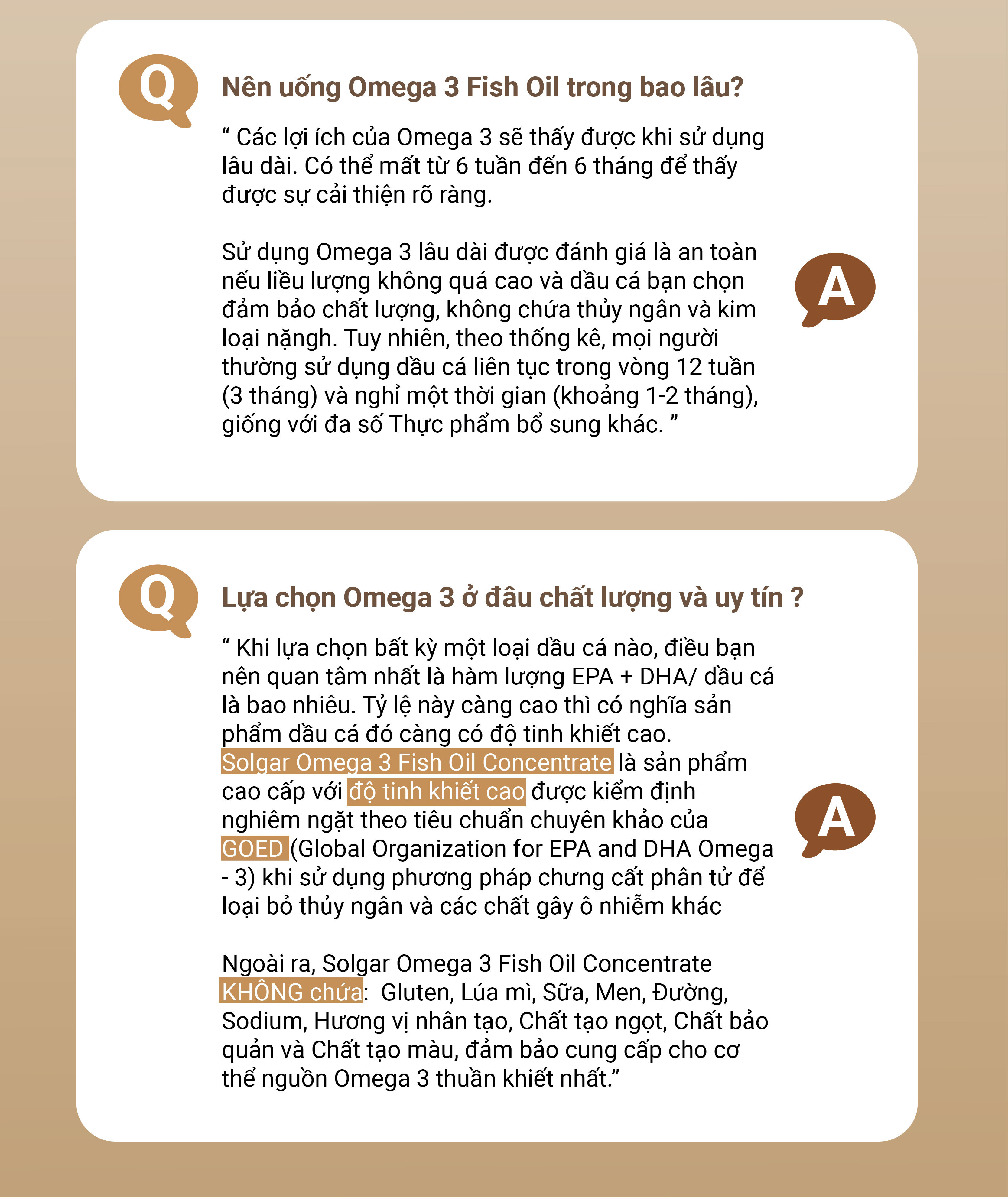 – Không biến đổi gen và không chứa gluten; Viên nang mềm Solgar Omega 3 không chứa: gluten, lúa mì, sữa, men, đường, natri, hương nhân tạo, chất tạo ngọt và màu