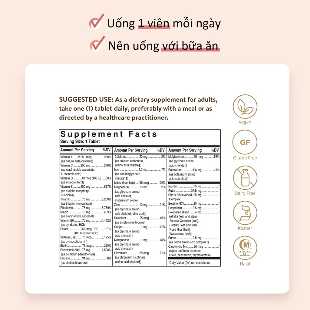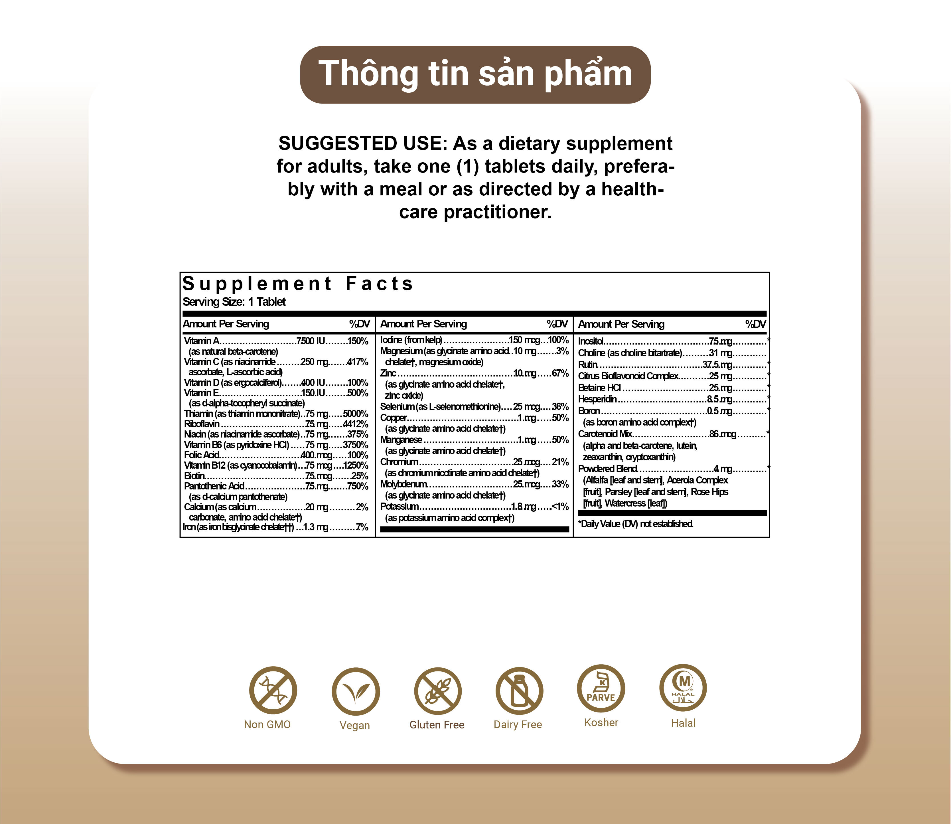 – Không chứa: Gluten, lúa mì, men, đường, muối, hương vị nhân tạo