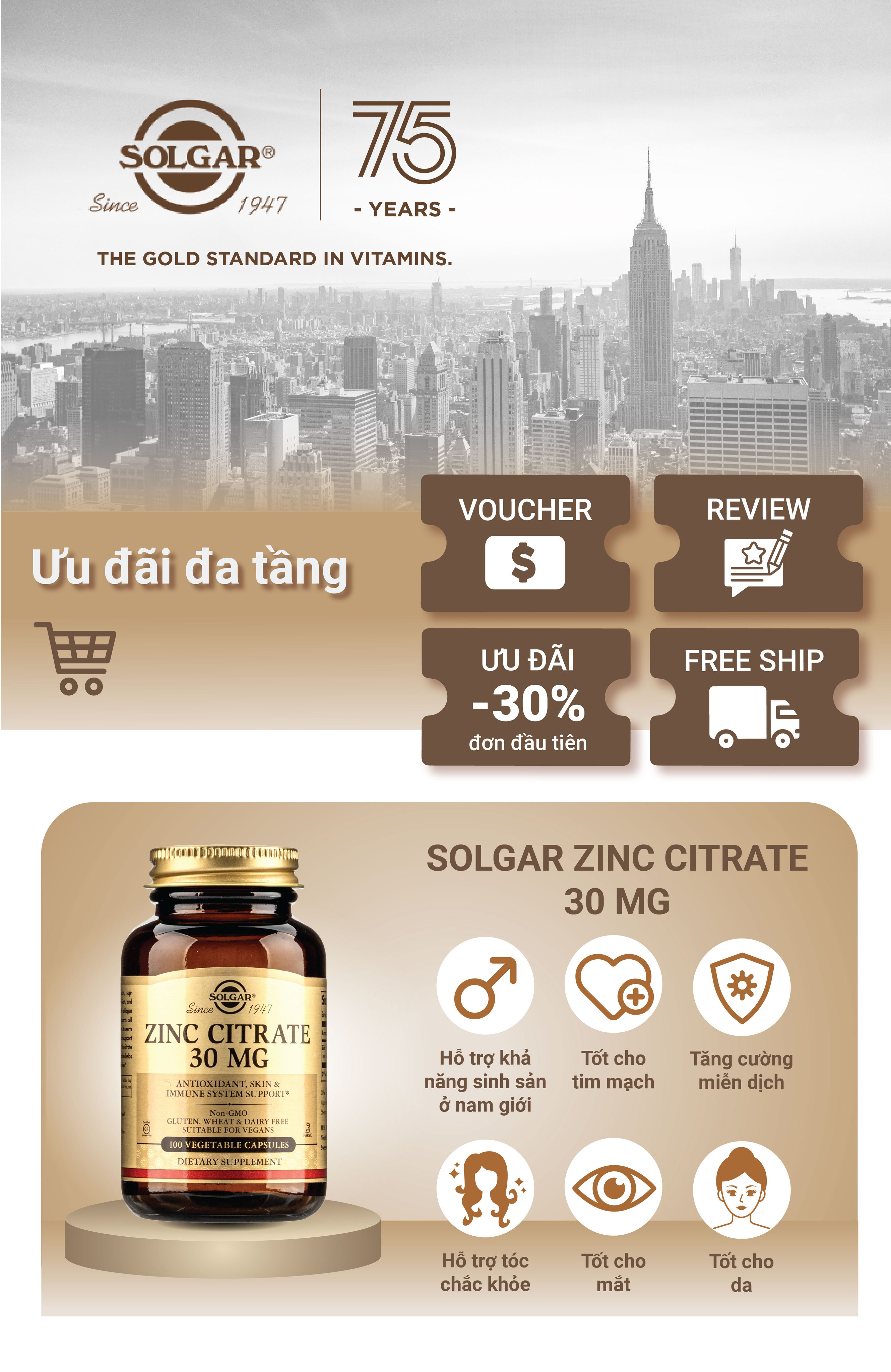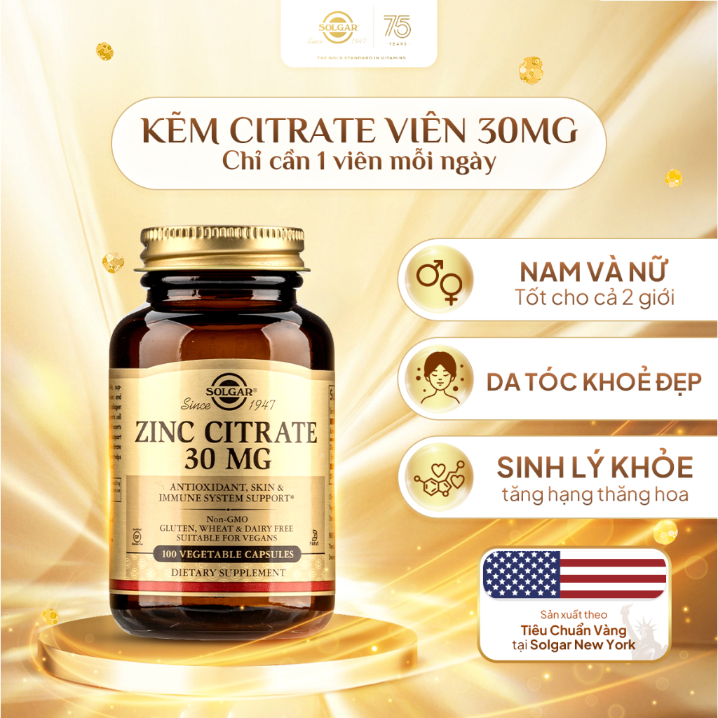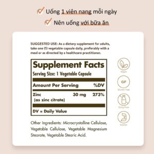 Hấp thụ tối ưu; Solgar Zinc Citrate chứa dạng kẽm citrate giúp thúc đẩy sự hấp thụ tối ưu; 30 mg kẽm trong công thức này chiếm 273% giá trị khuyến nghị hàng ngày