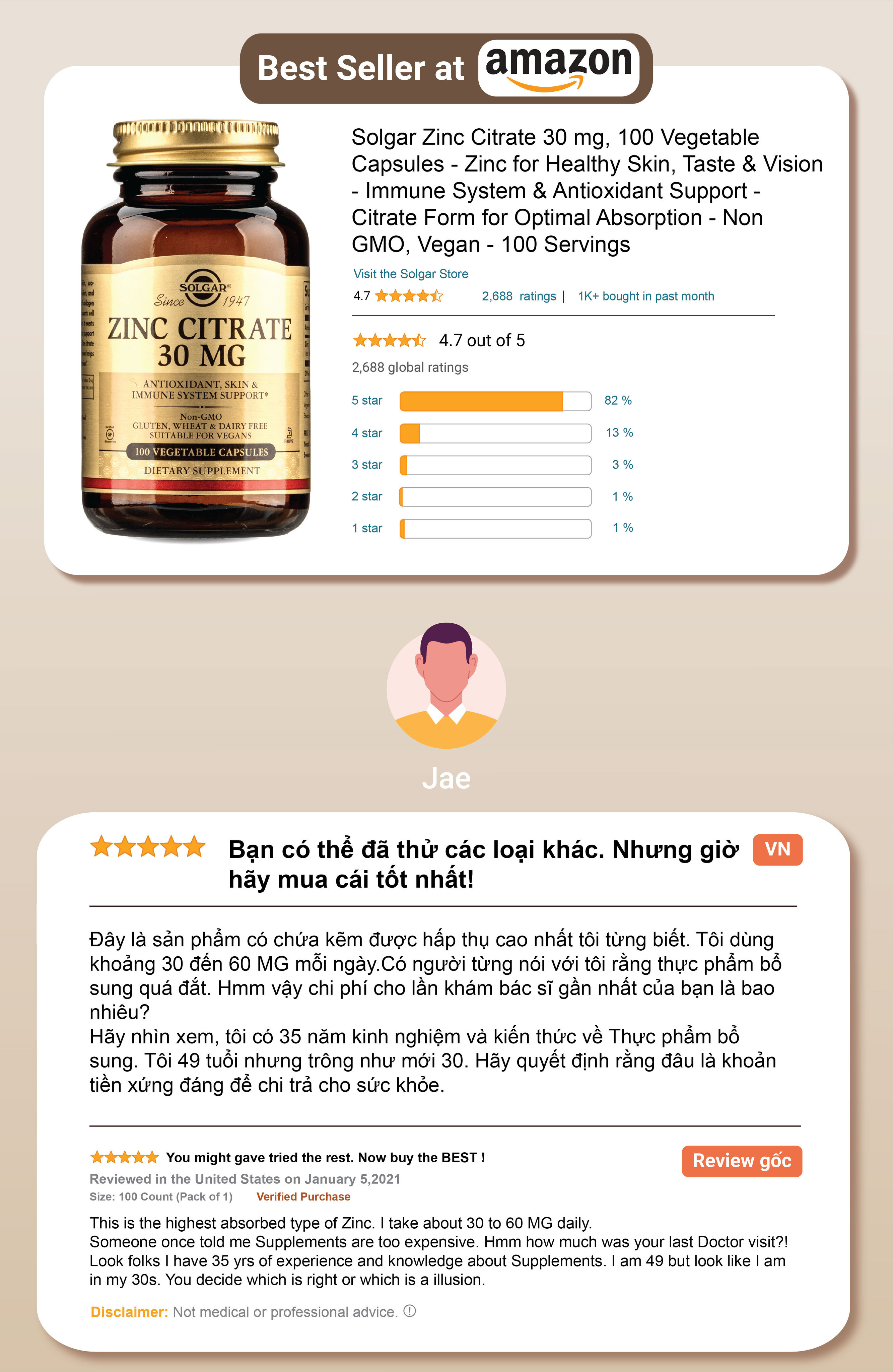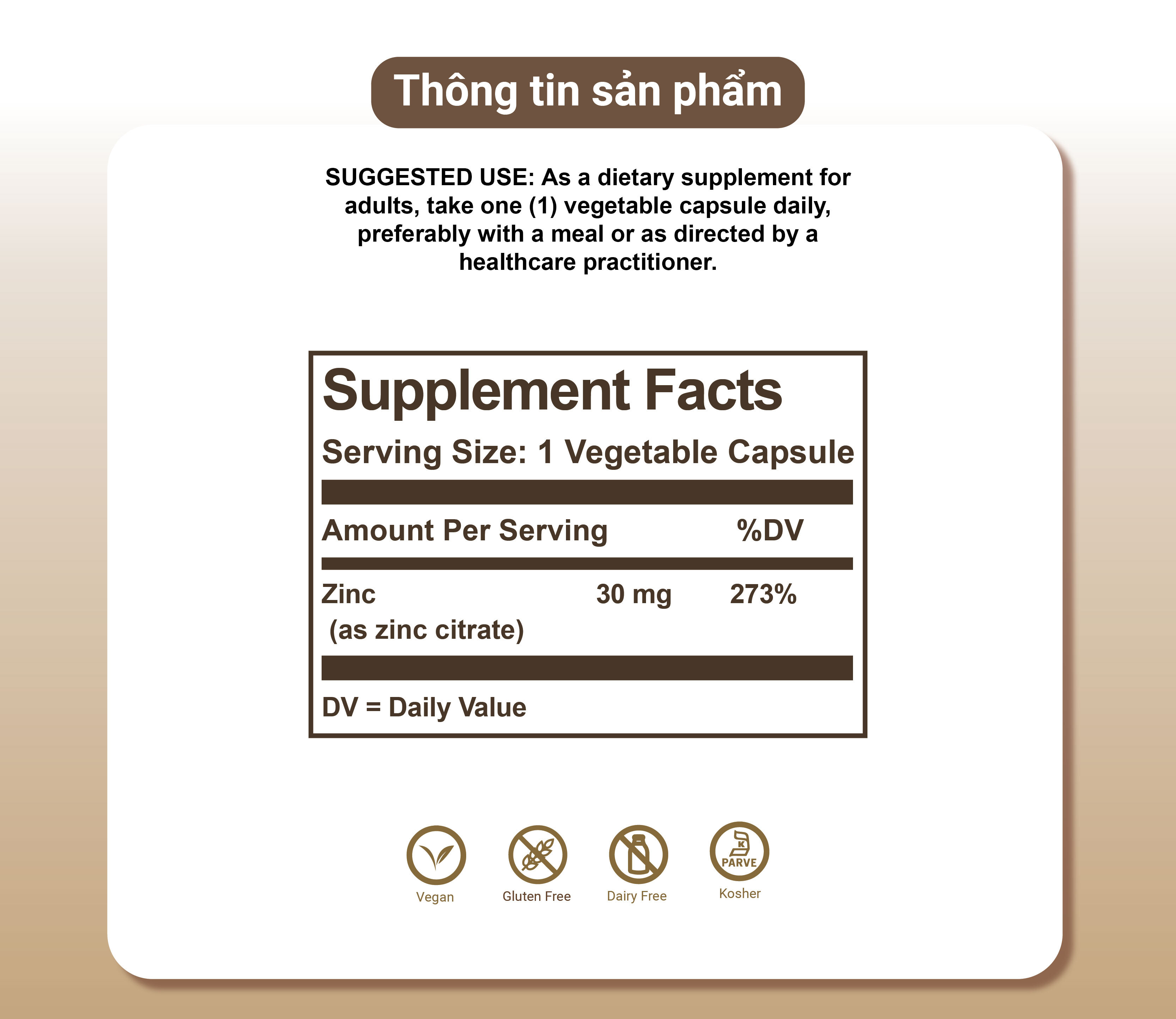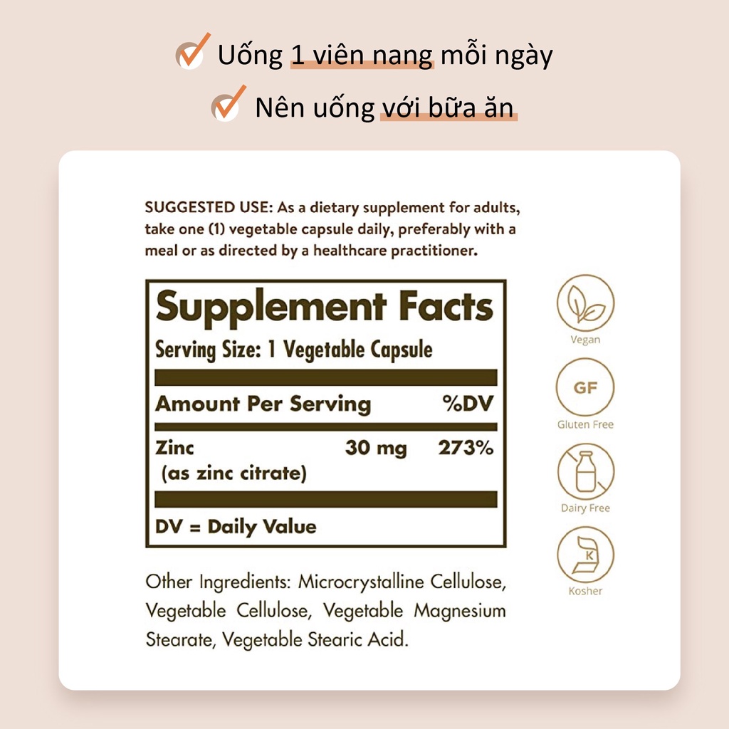 Không biến đổi gen, không chứa gluten và Kosher; Viên nang thực vật Solgar Zinc Citrate thích hợp cho người ăn chay; Không chứa: gluten, lúa mì, sữa, đậu nành, men, đường, natri, hương vị nhân tạo và chất làm ngọt