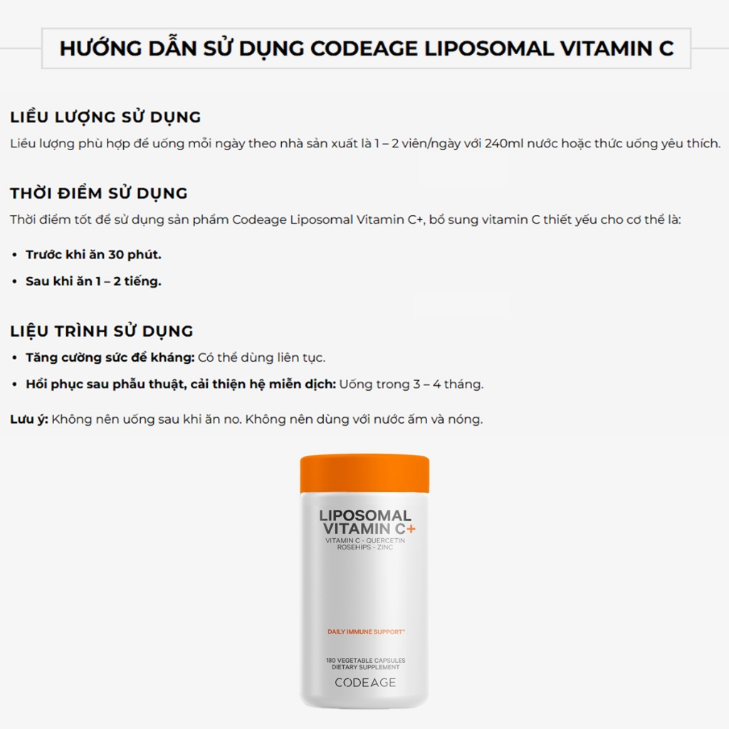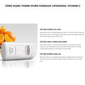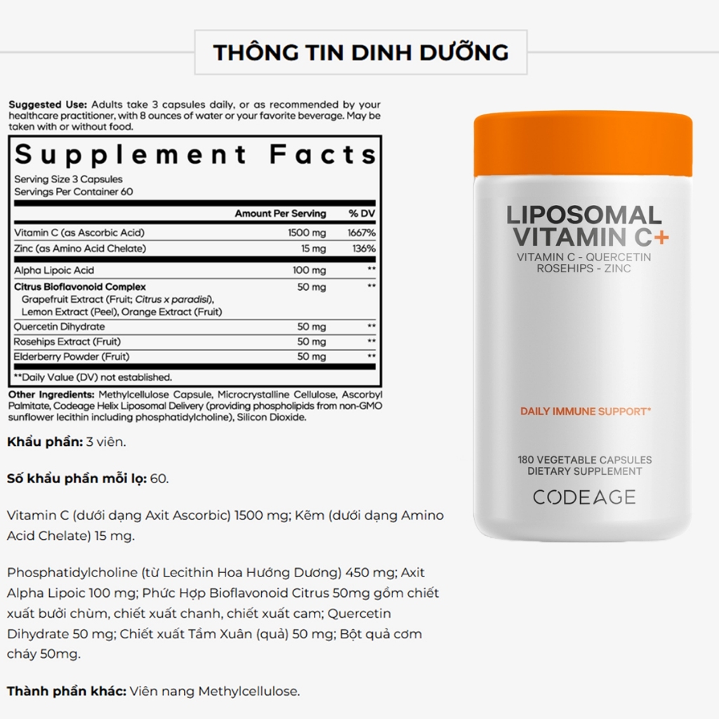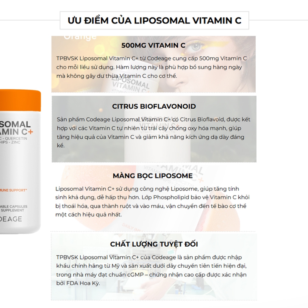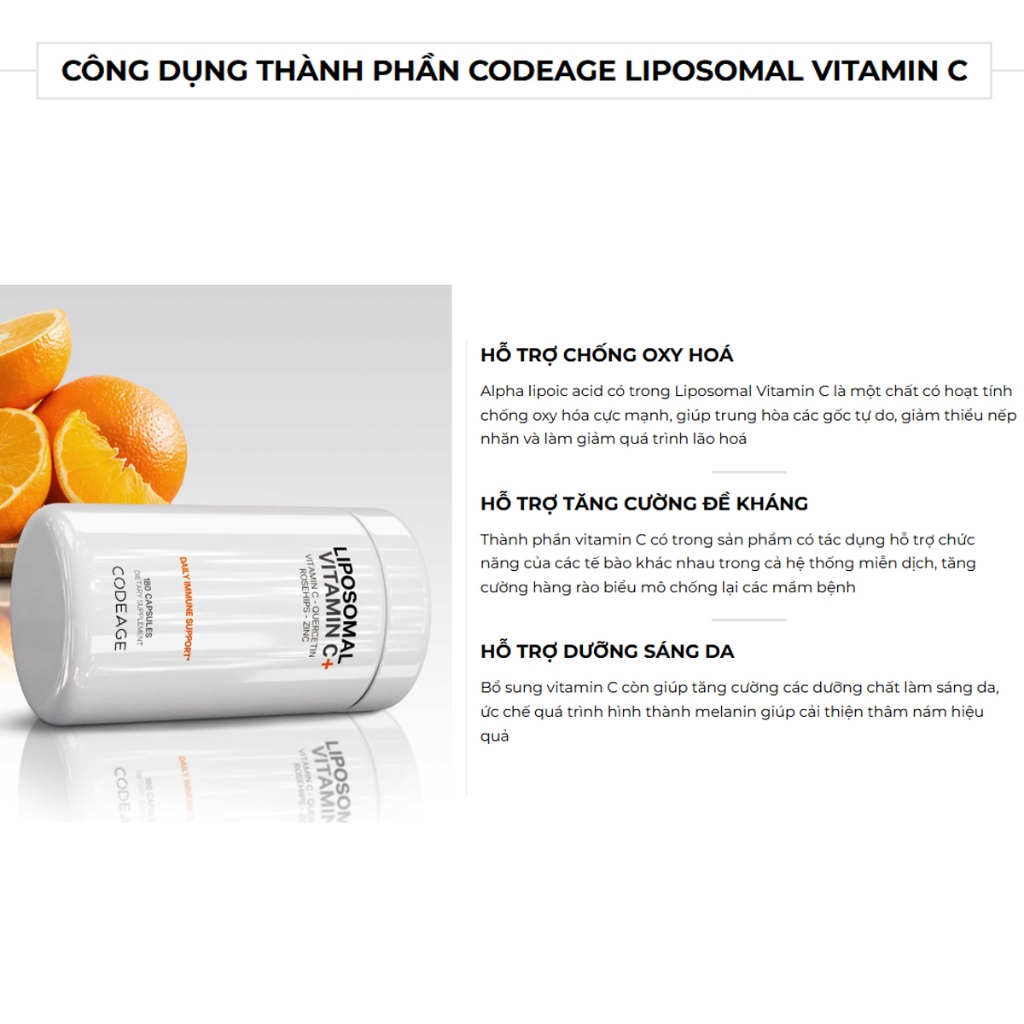 – Codeage Liposomal Vitamin C+ là thực phẩm bảo vệ sức khỏe cao cấp được sản xuất tại Mỹ với quy trình đạt chuẩn cGMP. Khác biệt hoàn toàn với các dòng vitamin C truyền thống, sản phẩm của Codeage sử dụng hệ thống vận chuyển Liposome giúp bảo vệ các phân tử vitamin không bị phân hủy bởi dịch vị dạ dày, từ đó đưa dưỡng chất trực tiếp đến các mô và tế bào cần thiết.
