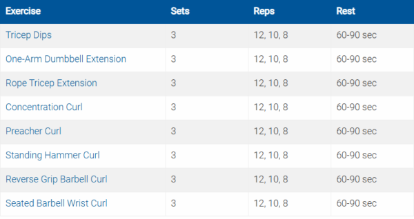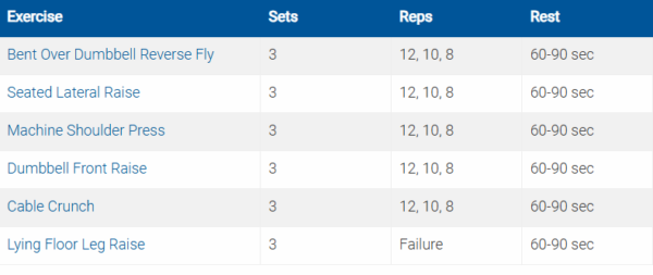 Mỗi buổi tập trong chương trình Sculpted Strength – The Ultimate 12 Week Bodybuilding Program đều phối hợp ít nhất 2 nhóm cơ khác nhau, bao gồm cả bắp chân (calves) và cẳng tay (forearms).