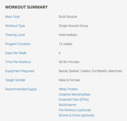 Chương trình này bao gồm 6 buổi tập mỗi tuần, tập trung phát triển từng nhóm cơ riêng biệt. Mỗi buổi kéo dài khoảng 60–90 phút, bao gồm cả thời gian khởi động và chuẩn bị.